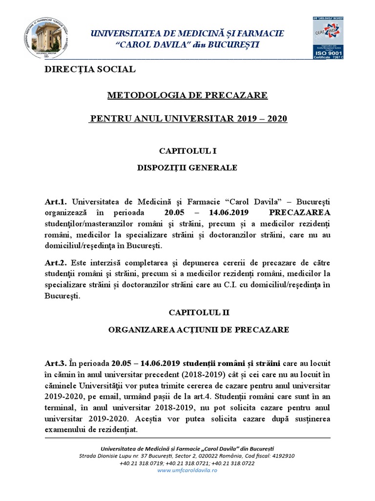 Metodologia De Precazare Pentru Anul Universitar 2019 2020